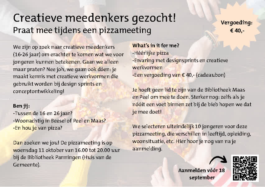 Wie tussen de 16 en 26 jaar oud is en in Peel en Maas of Beesel woont, is welkom om zich aan te melden voor de meeting. Deze vindt plaats bij de bieb in Panningen. Naast praten en pizza’s eten is er ook aandacht voor creatieve werkvormen die gebruikt worden bij designsprints en conceptontwikkeling.