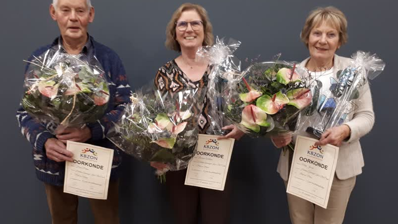 Drie leden van het gemengde zangkoor Bel Canto uit Helden zijn in het zonnetje gezet vanwege hun jub...