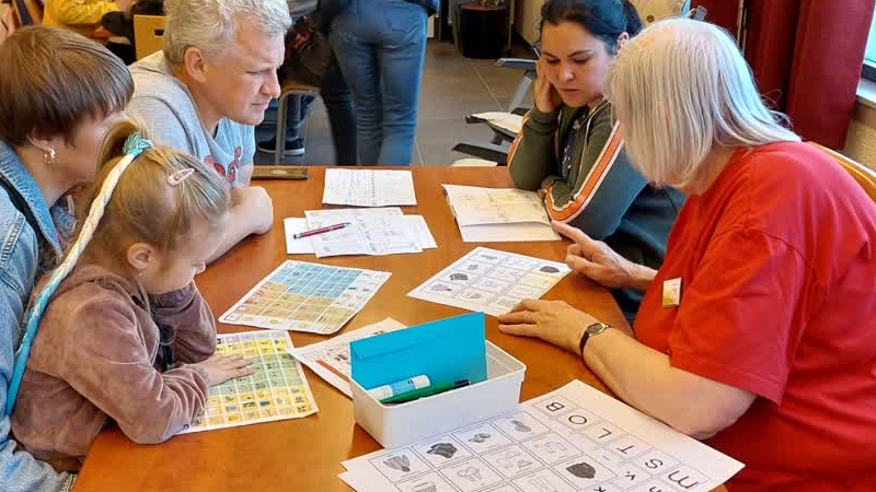 Inwoners van Grashoek geven taallessen aan de Oekrainse vluchtelingen die zijn opgevangen in het dor...