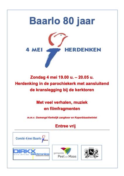 Het Comité 4 mei Baarlo organiseert een uitgebreide herdenking in de parochiekerk van Baarlo met aansluitend de kranslegging bij de kerktoren aan de Markt.