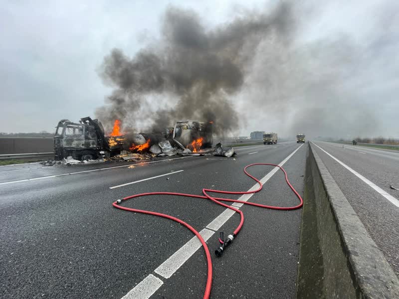 De trekker met oplegger stond ter hoogte van het Maasbrese buurtschap Siberië op een vluchthaven aan de kant van de snelweg en brandde helemaal uit. Volgens een woordvoerder was de vrachtwagen geladen met kaas.