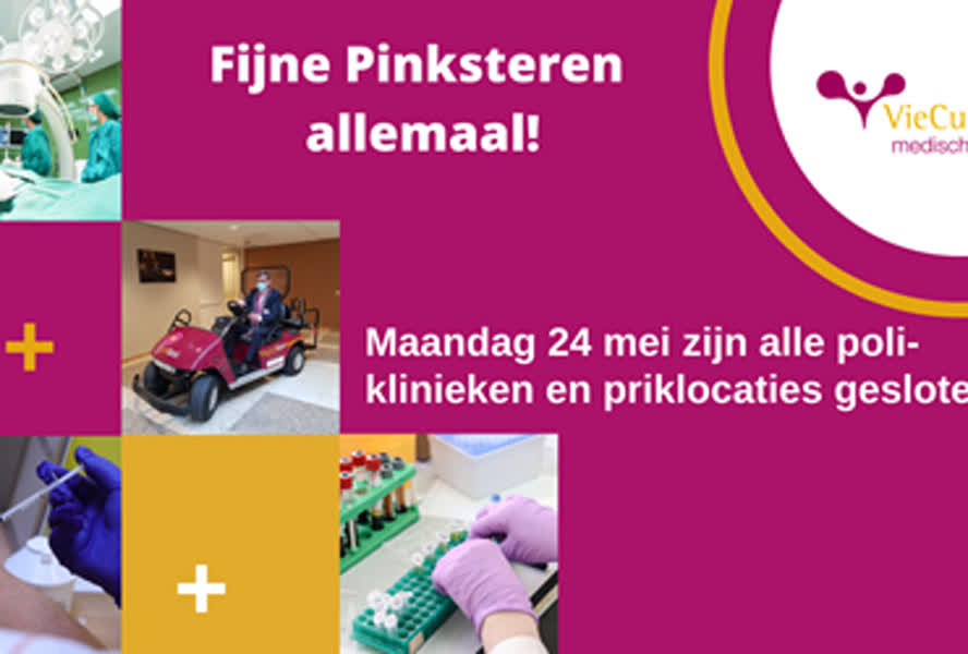 Op tweede Pinksterdag (24 mei) is het niet mogelijk om bloed te prikken bij de priklocaties. Kijk op www.viecuri.nl/bloedafname wanneer je terecht kunt bij de beschikbare priklocaties. Daarnaast is het niet mogelijk om bij de afdeling Radiologie röntgenfoto’s te laten maken. Kijk op www.viecuri.nl/rontgen wanneer je terecht kunt bij de beschikbare locaties.