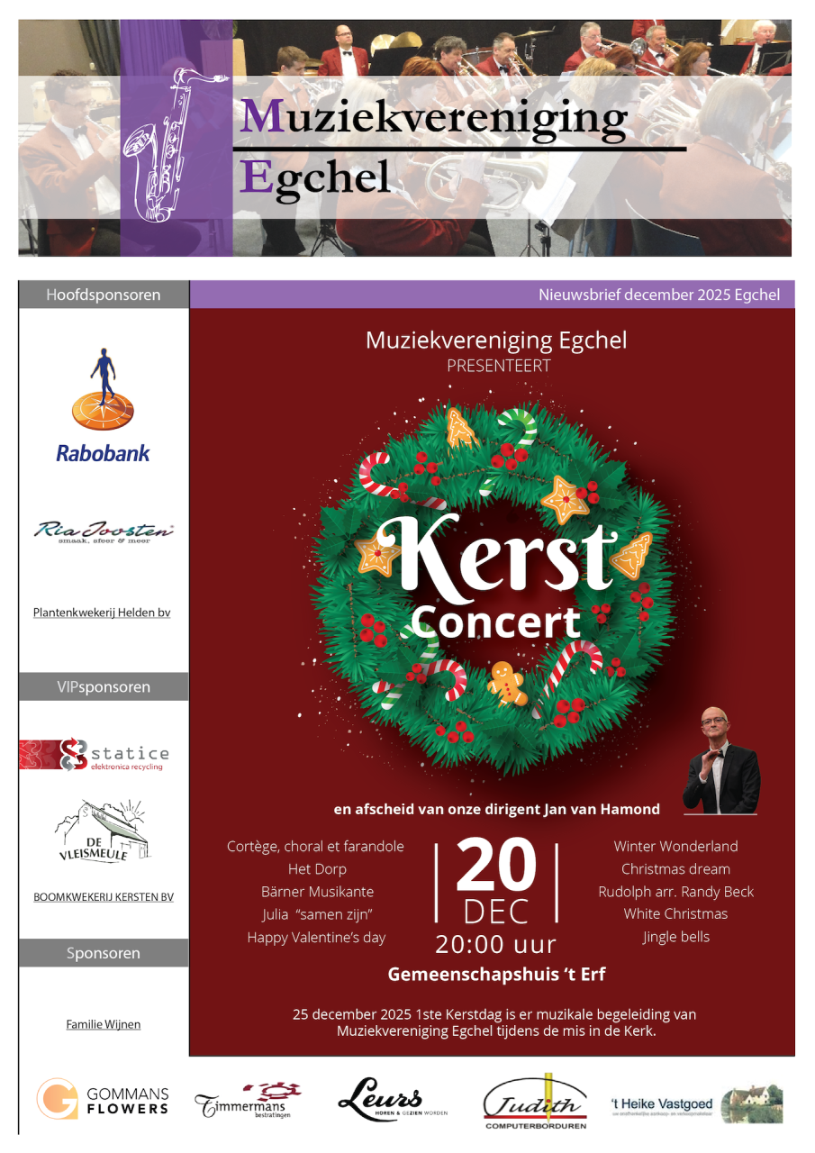 Muziekvereniging Egchel geeft donderdag 25 december (1ste kerstdag) muzikale begeleiding tijdens de mis in de kerk.