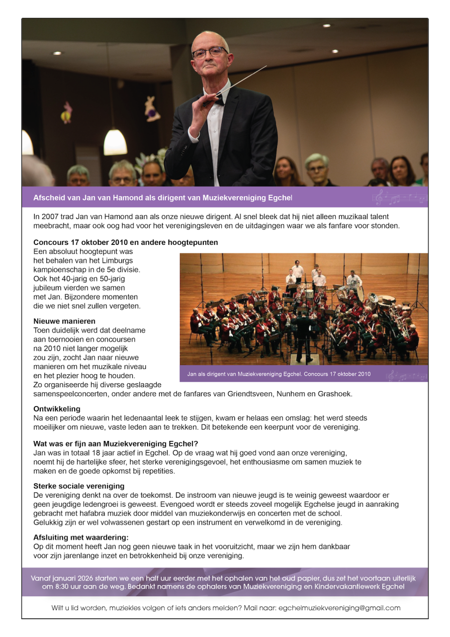 Jan van Hamond was in totaal 18 jaar actief als dirigent in Egchel. De muziekvereniging is Jan dankbaar voor zijn jarenlange inzet en betrokkenheid.