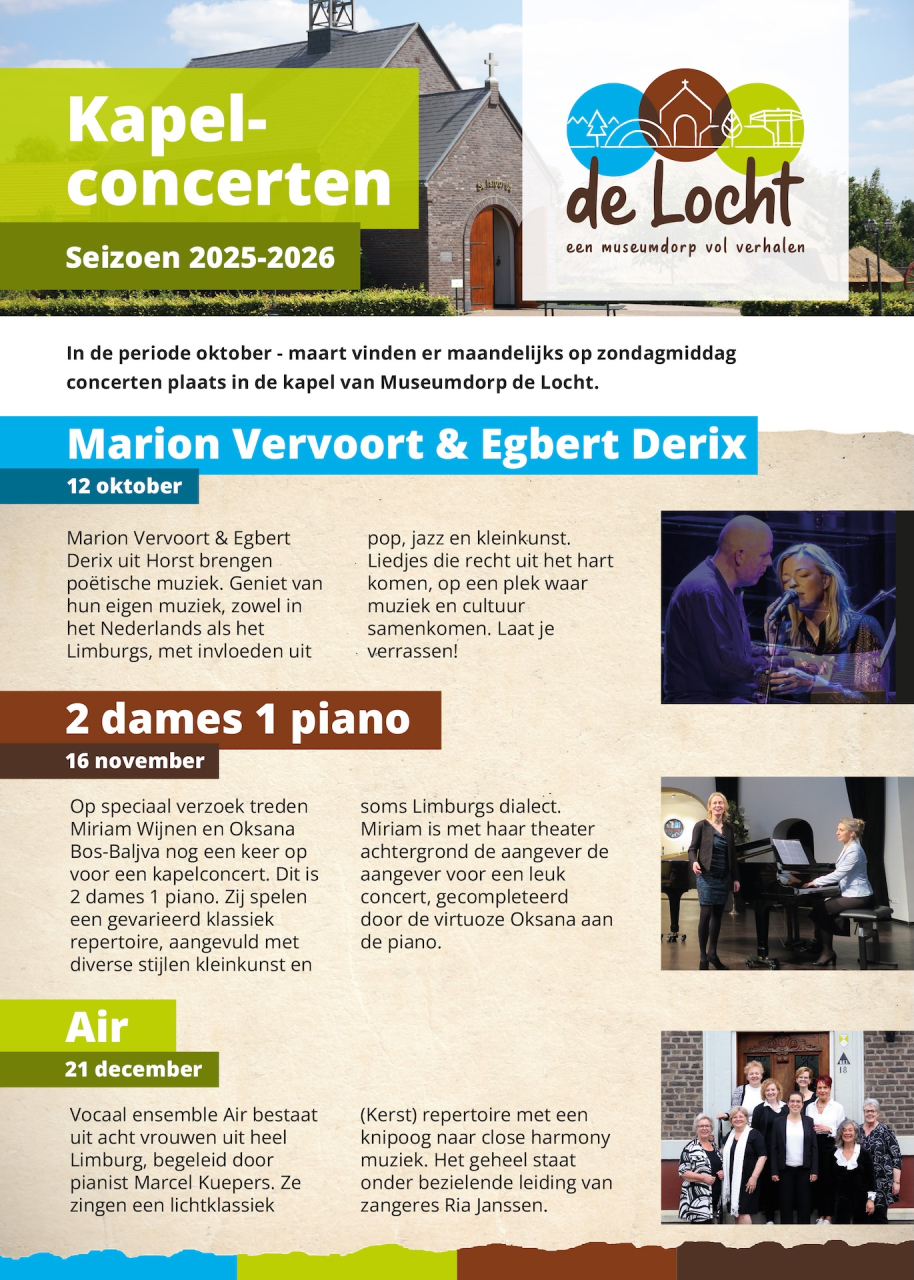 Beleef de magie van muziek op een unieke locatie tijdens de nieuwe reeks kapelconcerten in Museumdorp De Locht. Laat je meevoeren door sfeervolle klanken.