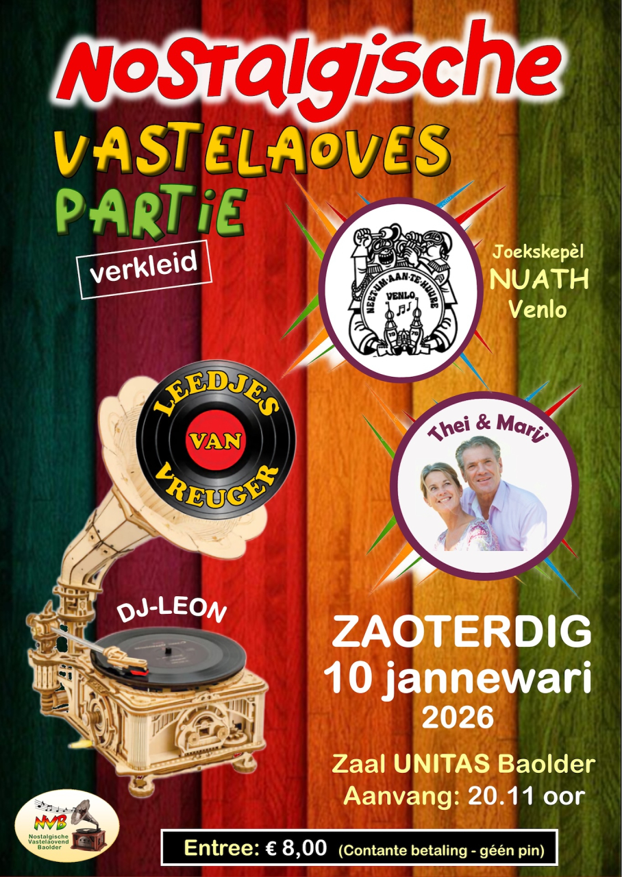 De Nostalgische Vastelaoves Partie wordt gehouden in Zaal Unitas in Baarlo op zaterdag 10 januari en begint om 20.11 uur. De entree is 8,00 euro; alleen contante betaling (géén pin-mogelijkheid).