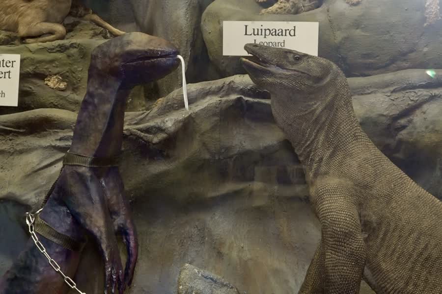 Kunstenaar Hadrien Gerenton maakte een moderne versie van de komodovaraan, een dier dat in het Missiemuseum een centrale plek inneemt. Zijn hagedissen bewegen zich vrij door de zalen, los van hun vitrines. Een van de beelden is nog verbonden met het originele dier uit de collectie, als verwijzing naar macht en koloniale verhoudingen.