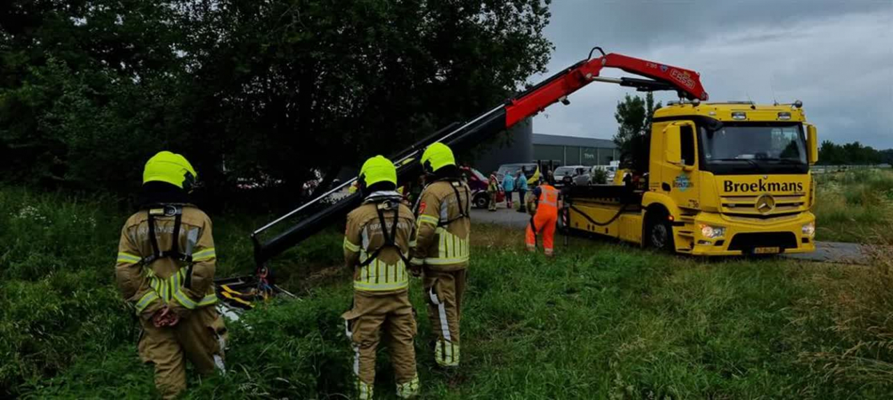 Auto op kop in sloot: inzittende uit voertuig gehaald