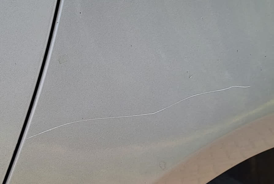 Vermoedelijk is de schade veroorzaakt door iemand die al fietsend langs de auto’s reed.