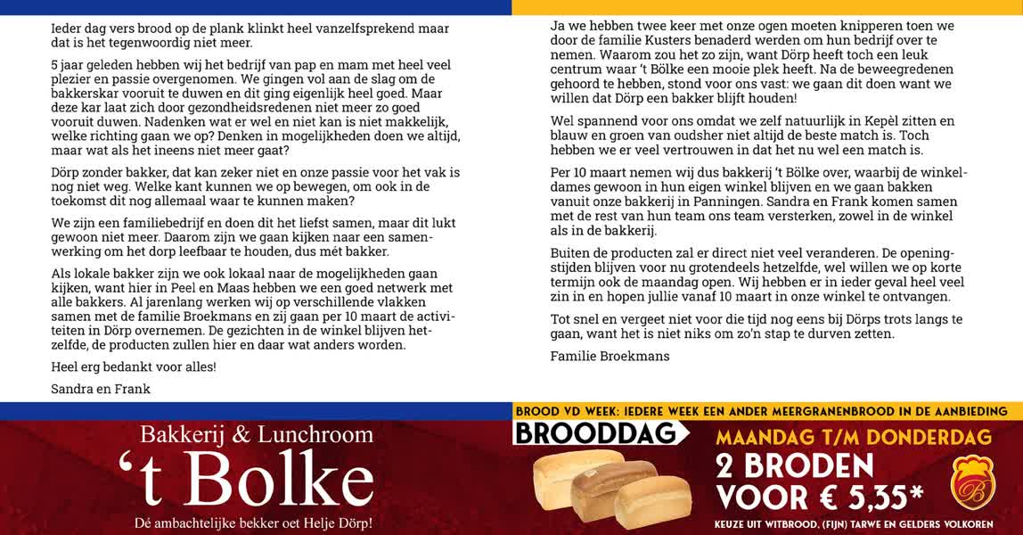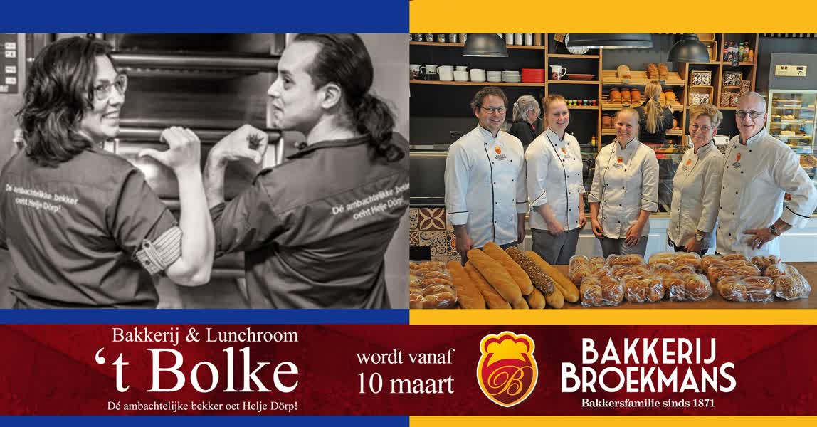 Bakkerij ’t Bölke in Helden wordt per 10 maart overgenomen door Bakkerij Broekmans. De huidige eigenaren van ’t Bölke dragen hun bakkerij wegens gezondheidsredenen over. “Iedere dag vers brood op de plank klinkt vanzelfsprekend, maar dat is het tegenwoordig niet meer.”