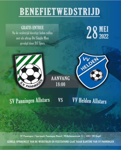 De wedstrijd vindt plaats op zaterdag 28 mei op Sportpark Panningen Noord, veld 1 en begint om 18.00 uur.