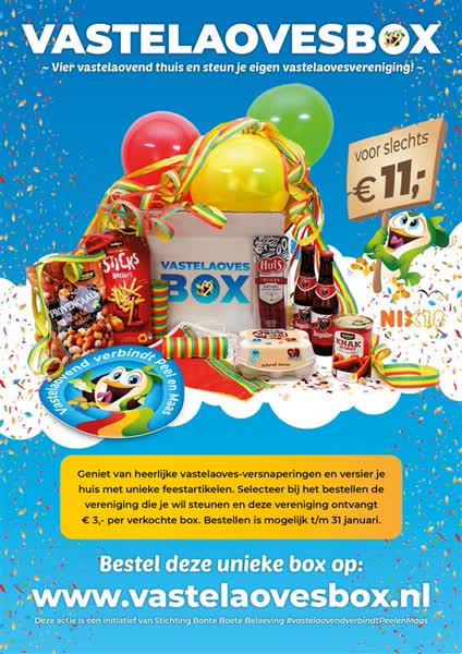 Bij het bestellen van de box kun je aangeven welke vastelaovesvereniging er gesteund wordt met de aankoop ervan. Hiermee ontvangt de betreffende vereniging € 3,- per box. 'Voor de verenigingen in Peel en Maas dus een zeer welkome bijdrage in deze periode', aldus de initiatiefnemers.