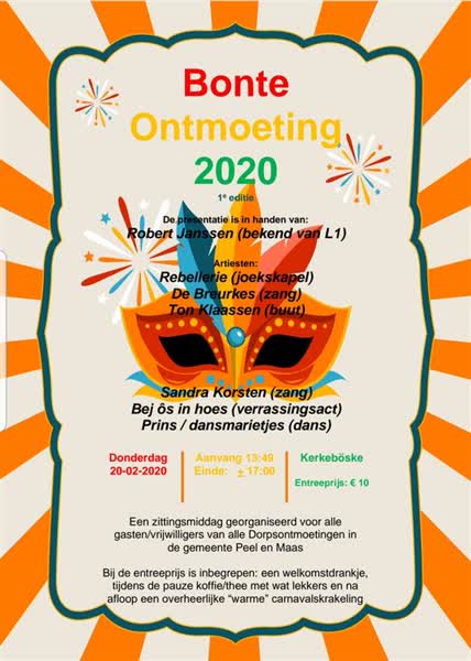 Een zittingsmiddag georganiseerd voor alle gasten/vrijwilligers van alle Dorpsontmoetingen in de gemeente Peel en Maas Donderdag 20 februari, Kerkeböske Helden. Aanvang 13.49 uur tot ca 17.00 uur