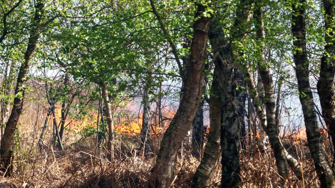 De brandweer maakt een stoplijn om de brand tegen te houden. Staatsbosbeheer is bezig met snoeien om te zorgen dat het vuur zich niet verder verspreid.