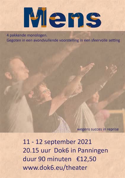 Een avondvullende voorstelling in een sfeervolle setting bij DOK6 in Panningen op zaterdag 11 en zondag 12 september. Aanvang: 20.15 uur. Duur: 90 minuten exclusief pauze. 4 spelers en 2 regisseurs hebben zich verenigd in collectief ‘MENS’. De voorstelling wordt muzikaal omlijst door gitarist Nick Verberne uit Heusden.