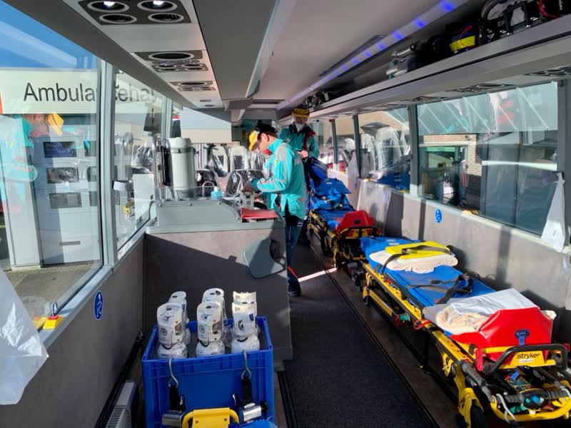 De patiënten zijn per ambulancebus, een omgebouwde touringcar, naar het ziekenhuis in Venray vervoerd. In de bus is ruimte voor zes brancards die met speciale riemen vastgezet kunnen worden.