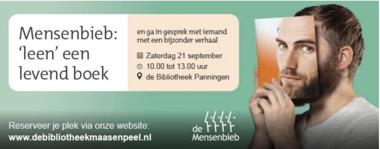 Bij de Mensenbieb 'leen' je levende boeken. Mensen met een indrukwekkend verhaal, die je normaal niet zo snel zou spreken. Denk aan seksueel misbruik, depressie, het leven oppakken na kanker, MS, Queer, pesten, gevlucht uit Oekraïne, zelfdoding partner, bijna-dood ervaring en nog veel meer. Iemand die afwijkt van de ‘norm’ en daardoor de kans loopt anders benaderd, buitengesloten of gediscrimineerd te worden. Je leert verhalen kennen die schuilgaan achter een naam, een woord, een gezicht. Mensenbieb-ontmoetingen kunnen je blik verruimen en werelden openen waar je geen weet van hebt.