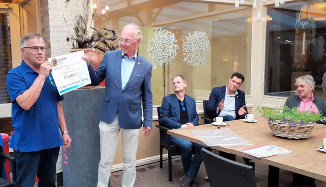De cheque werd door Lions-president Ruud Holthuis overhandigd aan Noud Janssen van Wensambulance Limburg.