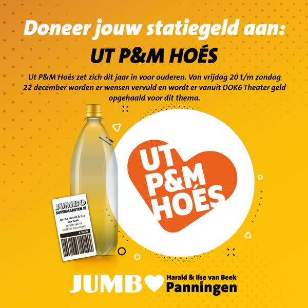 Vanaf 1 december kun je bij Jumbo Panningen en de PLUS in Reuver je statiegeld doneren aan 'Ut P&M Hoés' en zo activiteiten voor ouderen ondersteunen. Gedurende de hele maand december kun je jouw statiegeld in de emballageautomaat doneren.
