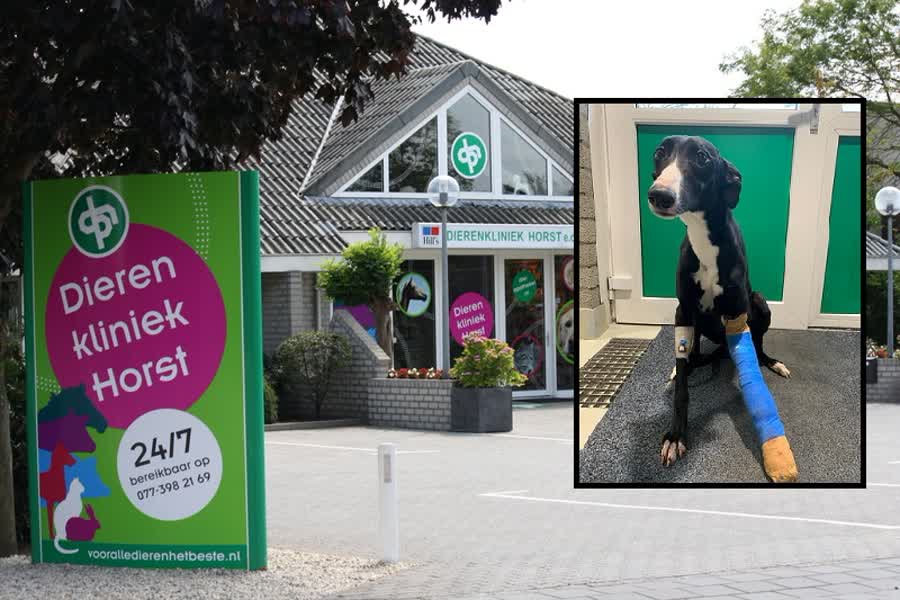 De viervoeter verblijft nu bij de dierenarts in Horst. De operatie die de reu nodig heeft, zou 2500 euro kosten. Het is niet bekend waaraan hij geopereerd moet worden.