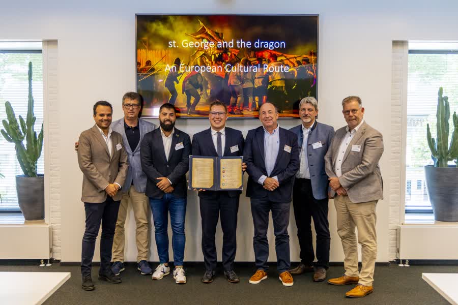 Samen met vertegenwoordigers van Furth im Wald (Duitsland), Grez-Doiceau (Belgïë), Monção (Portugal) en Montblanc (Spanje) hebben burgemeester Bob Vostermans van de gemeente Beesel en Hans van Kruchten van de stichting Draaksteken Beesel hun handtekening gezet onder de intentieovereenkomst ECR (Sint Joris en) de Draak.