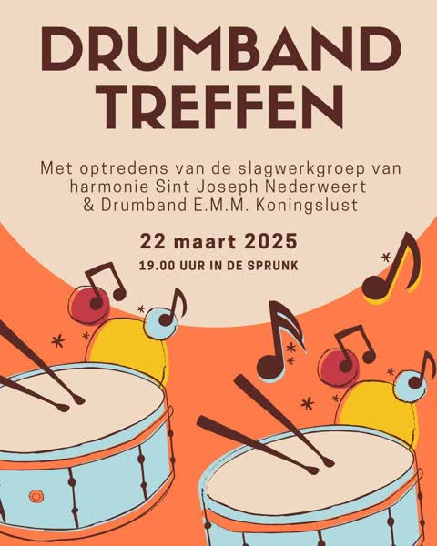 Het drumbandtreffen is in De Sprunk in Koningslust op zaterdag 22 maart om 19.00 uur. Iedereen is van harte welkom en de toegang is gratis.