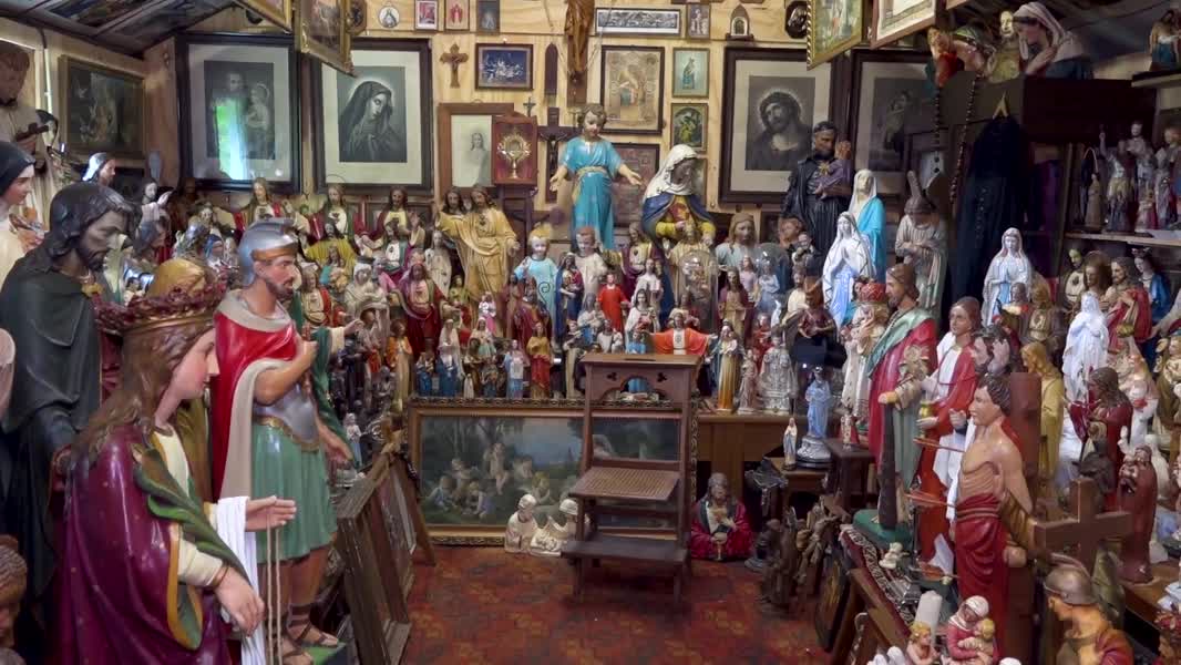 De beelden staan in een soort kapel uitgestald. De meeste beelden zijn uit Hoensbroek gehaald. “Twee vrienden van mij hebben een kerk in Vaals en in Hoensbroek een filiaal. Alles wat ze dubbel hebben, krijg ik dan”, vertelt de eigenaar. Ook op rommelmarkten worden veel beelden gevonden, al gaat het dan wel om de kleinere beelden.