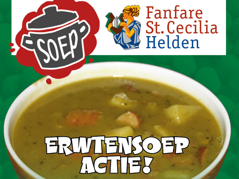 De erwtensoepactie van Fanfare St. Cecilia Helden gaat weer van start. Het ‘groen’ waar alle ‘dörpsblauwen’ gek op zijn. Geniet van erwtensoep met roggebrood en balkenbrij of een pannenkoek.