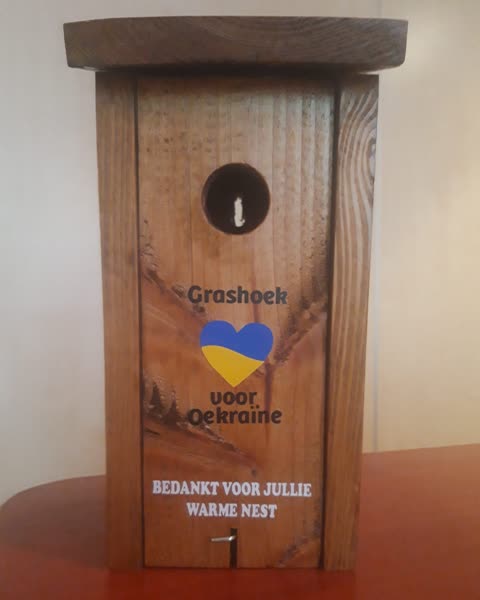 Het bedankje is een vogelhuisje met het 'Grashoek voor Oekraïne'-logo en de tekst "bedankt voor jullie warme nest". De vogelhuisjes zijn gemaakt door vrijwilligers die dit doen om geld op te halen voor de bestrijding van de ziekte van Huntington.