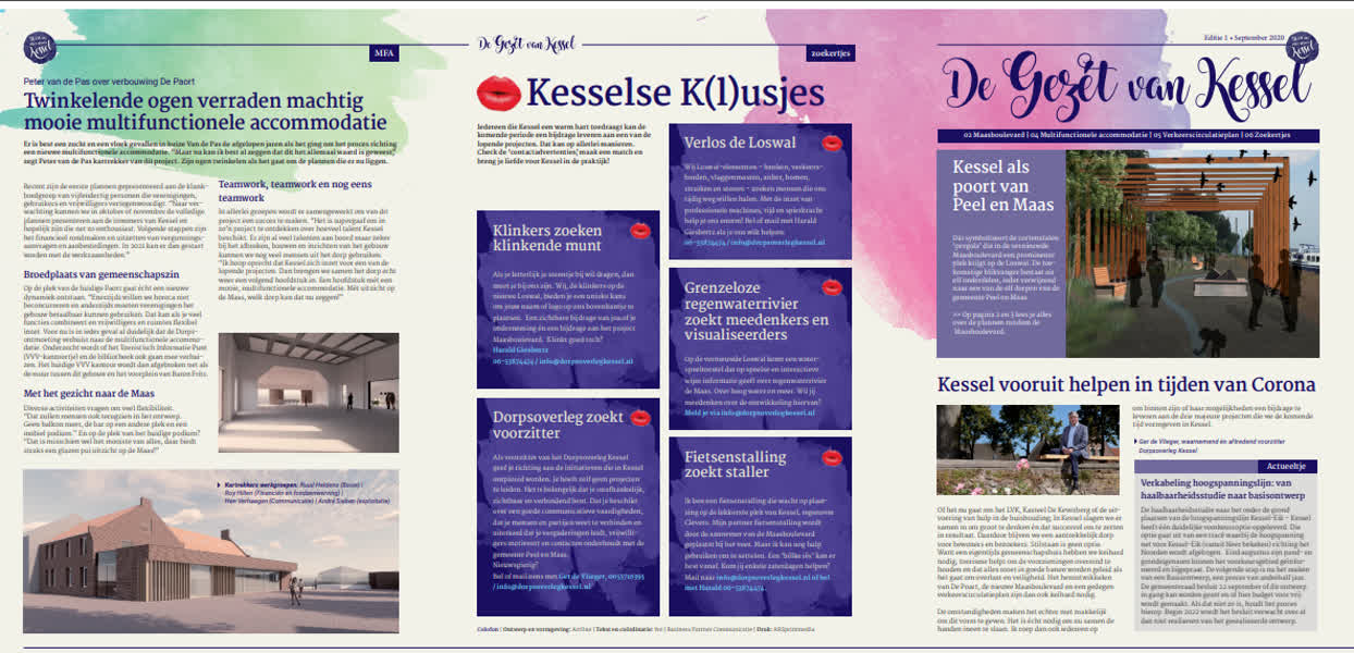 Met deze periodieke uitgave kunnen – nu grote bijeenkomsten niet makkelijk te organiseren zijn – inwoners van Kessel geïnformeerd worden over de voortgang van de diverse projecten, zoals het gemeenschapshuis en de ontwikkeling van de Maasboulevard.