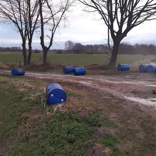 Het gaat om 7 witte tanks van 1.000 liter en 21 blauwe vaten met 200 liter afval. Ook lagen er verschillende jerrycans op de grond. Volgens ooggetuigen lekten de vaten.