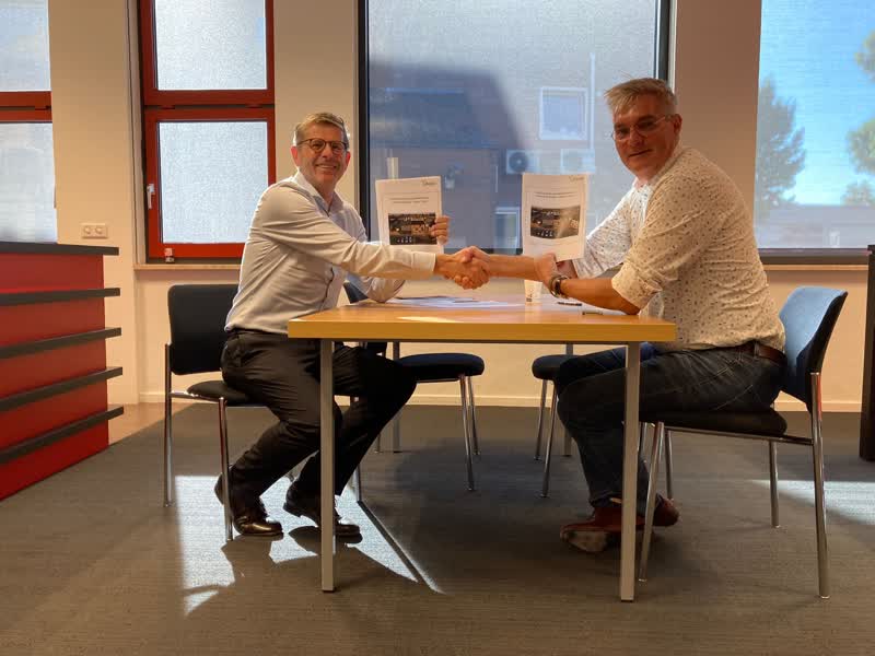 Wethouder Marcel Roelofs en bestuurder Harrie Oosterlee ondertekenen de samenwerking Foto: Gemeente Beesel