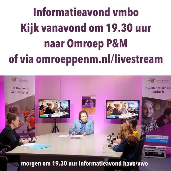 Omroep P&M zendt maandag 23 november en dinsdag 23 november de informatieavonden uit van Het Bouwens. Op maandag wordt de VMBO informatieavond uitgezonden, een dag later de informatiebijeenkomst van havo/vwo.