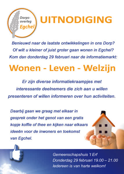 Tijdens de informatiemarkt, een initiatief van Dorpsoverleg Egchel, komen de laatste ontwikkelingen in Egchel aan bod. Ook is er aandacht voor wonen in het dorp, bijvoorbeeld wat de mogelijkheden zijn als inwoners groter of juist kleiner willen wonen.