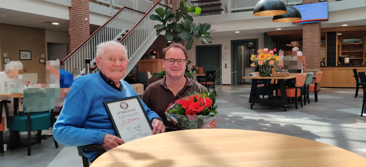 Erelid Jo Lenaers is 80 jaar lid bij voetbalvereniging RKMSV Meijel. Een bijzondere mijlpaal voor Lenaers. Hij kreeg vanuit de voorzitter en een bestuurslid thuis een oorkonde en een bosje bloemen overhandigd.