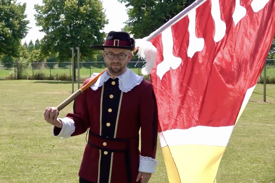 Als vendelier speelt Joost een bijzondere rol binnen de vereniging, legt hij uit. “Dat is iets anders dan de vaandeldrager. De vendelier loopt vóór het muziekkorps en achter de bordjesdrager, en maakt letterlijk de weg vrij. Met onze vlaggen vormen we patronen, die allemaal gelijk moeten zijn. Er zit een showelement in, maar ook een diepere betekenis.”