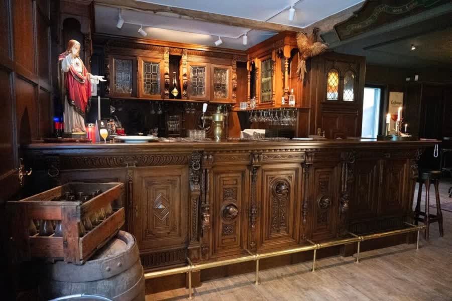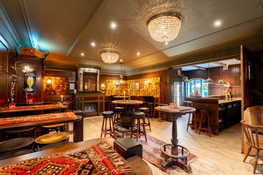 Jos Giesen Schildersbedrijf voerde het volledige schilder- en behangwerk van het café uit. Het merendeel van het schilderwerk werd met de kwast aangebracht, terwijl de plafonds airless werden gespoten met behulp van een sprayroller. De grootste uitdaging voor het team van schilders was het afstemmen van de kleuren van de wanden op het bestaande houtwerk in het interieur. Zo werd het plafond voorzien van een diepe donkergroene kleur en kreeg de entreehal een behang.