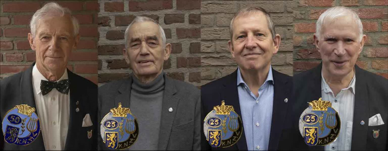 Het Maasbrees Mannenkoor heeft in december vorig jaar 4 jubilarissen gehuldigd. Lei Linders is 50 jaar lid, Mat Kappel, Chris Reumkens en Ton Theeuwen zijn 25 jaar lid. Een bestuursdelegatie heeft de 4 zangers op een coronaveilige manier gehuldigd. De jubilarissen ontvingen de KNZV-onderscheiding en een presentje en bloemen van het koor.Foto vlnr: Lei Linders, Mat Kappel, Ton Theeuwen en Chris Reumkens
