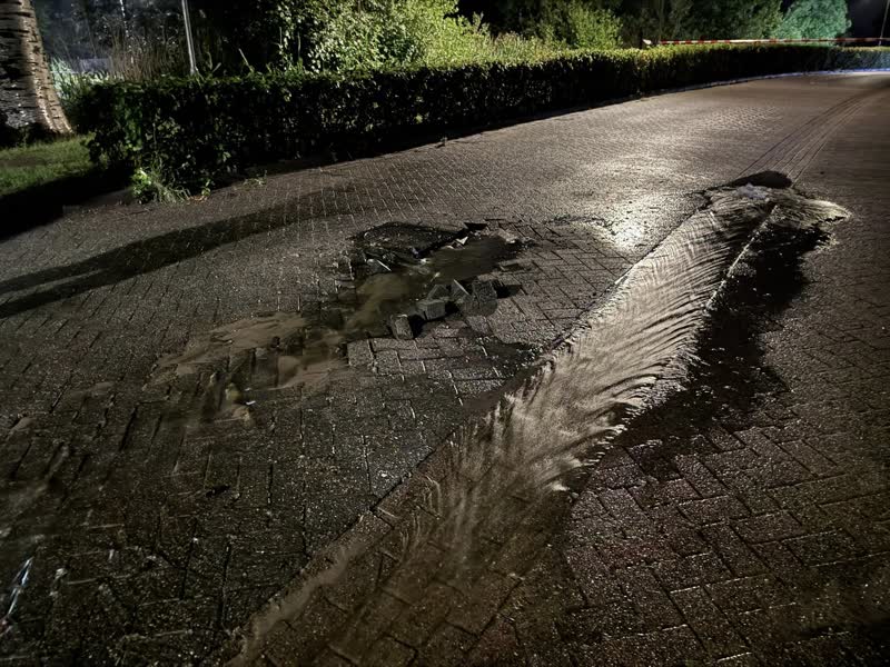 Op meerdere plekken in de straat kwam het wegdek omhoog door de druk van het water. Bij een woning liep de kelder volledig onder.