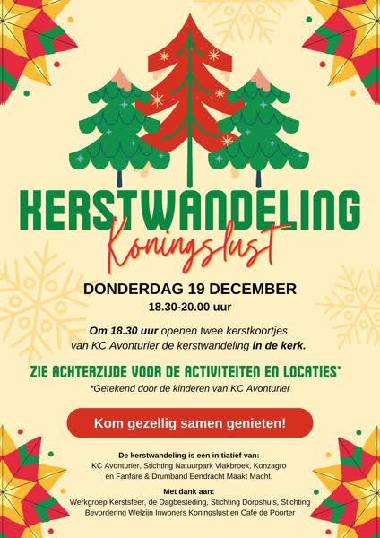 Koningslust wordt op donderdag 19 december ondergedompeld in kerstsfeer tijdens de jaarlijkse kerstwandeling. Tussen 18.30 en 20.00 uur kunnen inwoners en bezoekers genieten van een sfeervolle route langs diverse activiteiten en optredens. De avond wordt georganiseerd door KC Avonturier, Stichting Natuurpark Vlakbroek, Konzagro en Fanfare & Drumband Eendracht Maakt Macht.