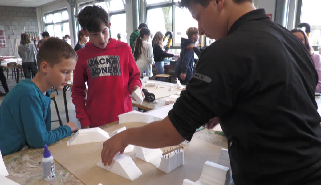 De docent Techniek van het Bouwens begeleidt de leerlingen met de opdracht. "Het is leuk om te zien hoe creatief de leerlingen zijn. Ze hebben op school al een ontwerp gemaakt voor de skatebaan en hier werken ze het uit met piepschuim." In het lokaal van de middelbare school kunnen de kinderen experimenteren en werken met materialen waar ze op hun eigen school niet mee werken.