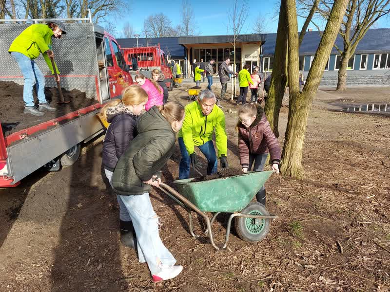 Hoveniersbedrijf Herman Vaessen ontwierp het buitenplan van de school. Vijf vrijwilligers van het IVN ondersteunden bij het planten. Groep 7 van de school ging aan de slag met het planten van een aantal bomen en struiken. Til Janssen van het IVN vertelt dat er ook aan natuureducatie gedaan wordt. “Tijdens het planten vertellen we over het nut en het effect van de bomen. Op deze manier doen we aan natuureducatie.”