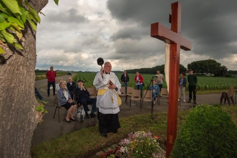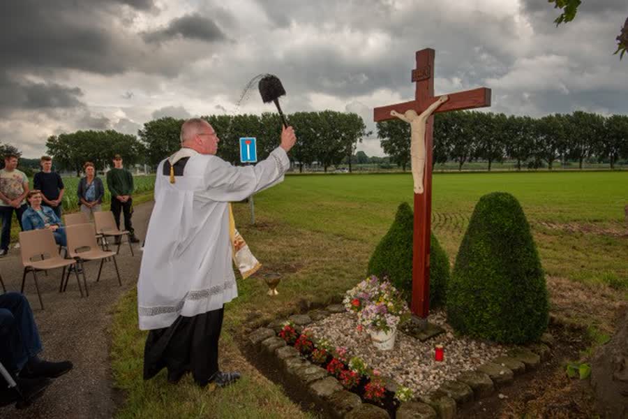 Het kruis bij de stuw in Baarlo is vrijdag ingezegend door kapelaan Hans te Boekhorst. Het wegkruis met corpus werd eerder vernield.