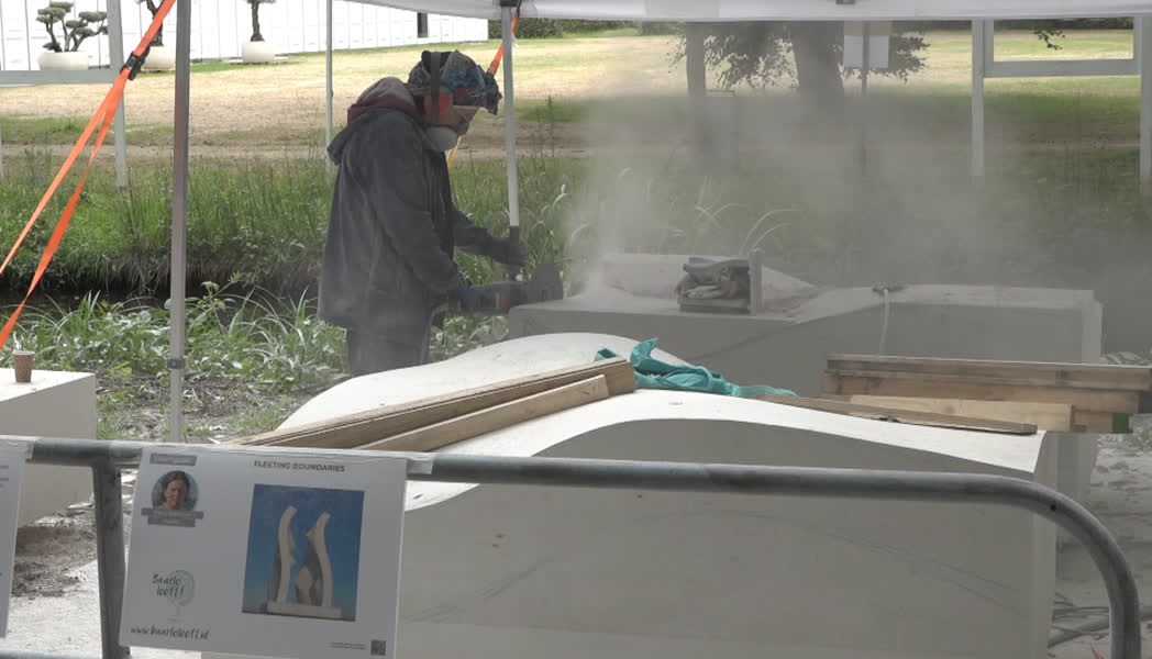 Renate Verbruggen uit Nieuw-Zeeland heeft met flink wat uitdagingen te maken, zo vertelt ze. In de drie stenen die ze kreeg om haar werk in te maken, zat een scheur. Toch blijft ze lachen. "Het is zo. Zo gaat het met natuurstenen. We zoeken naar oplossingen." Uiteindelijk heeft ze ervoor gekozen om een andere steen te bevestigen met een schroef, zodat ze verder kan werken.