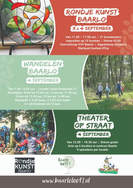 Baarlo staat begin september in het teken van drie evenementen. In het eerste weekend van september vinden Rondje Kunst Baarlo, Wandelen Baarlo en Theater op Straat plaats.