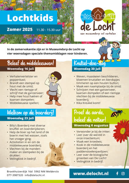 Onder de noemer LochtKids staat het museum op vier woensdagen - van 16 juli tot en met 6 augustus – in het teken van een ander thema, met volop activiteiten in het museumdorp. Van middeleeuwse ambachten tot knutselplezier en van natuurbeleving tot het leven op een vroegere boerderij: kinderen van alle leeftijden kunnen samen met hun (groot)ouders spelenderwijs ontdekken hoe het leven vroeger was.
