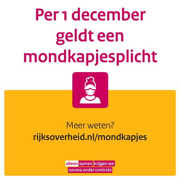 Om verspreiding van het coronavirus tegen te gaan is het dragen van een mondkapje voor iedereen van 13 jaar en ouder vanaf 1 december verplicht in alle openbare en overdekte ruimten, in het onderwijs, het openbaar vervoer en bij contactberoepen.