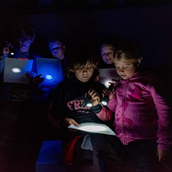 Met een zaklamp zoeken kinderen met hun ouders in het museum naar antwoorden op oplichtende vragen op de muren om een heel nieuw raadsel op te lossen.