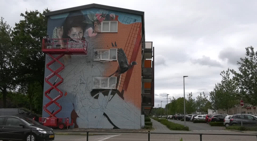 "Het thema is Moeder Natuur. Ik probeer met mijn muurschilderingen over te brengen dat mensen beter met de natuur moeten omgaan." Het gezicht in de mural is van zijn eigen vrouw. Een van de buurtbewoners ziet het gezicht van Edith Piaff in de schildering. "Ik vind het wel heel mooi", zegt de voorbijganger.