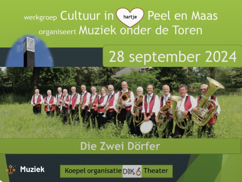 Zaterdag 28 september kun je de hele middag (van 13.30 tot 16.45 uur) luisteren naar Blaaskapel Die Zwei Dörfer Meijel/Neerkant; een kapel die garant staat voor een middagje genieten van mooie blaasmuziek.